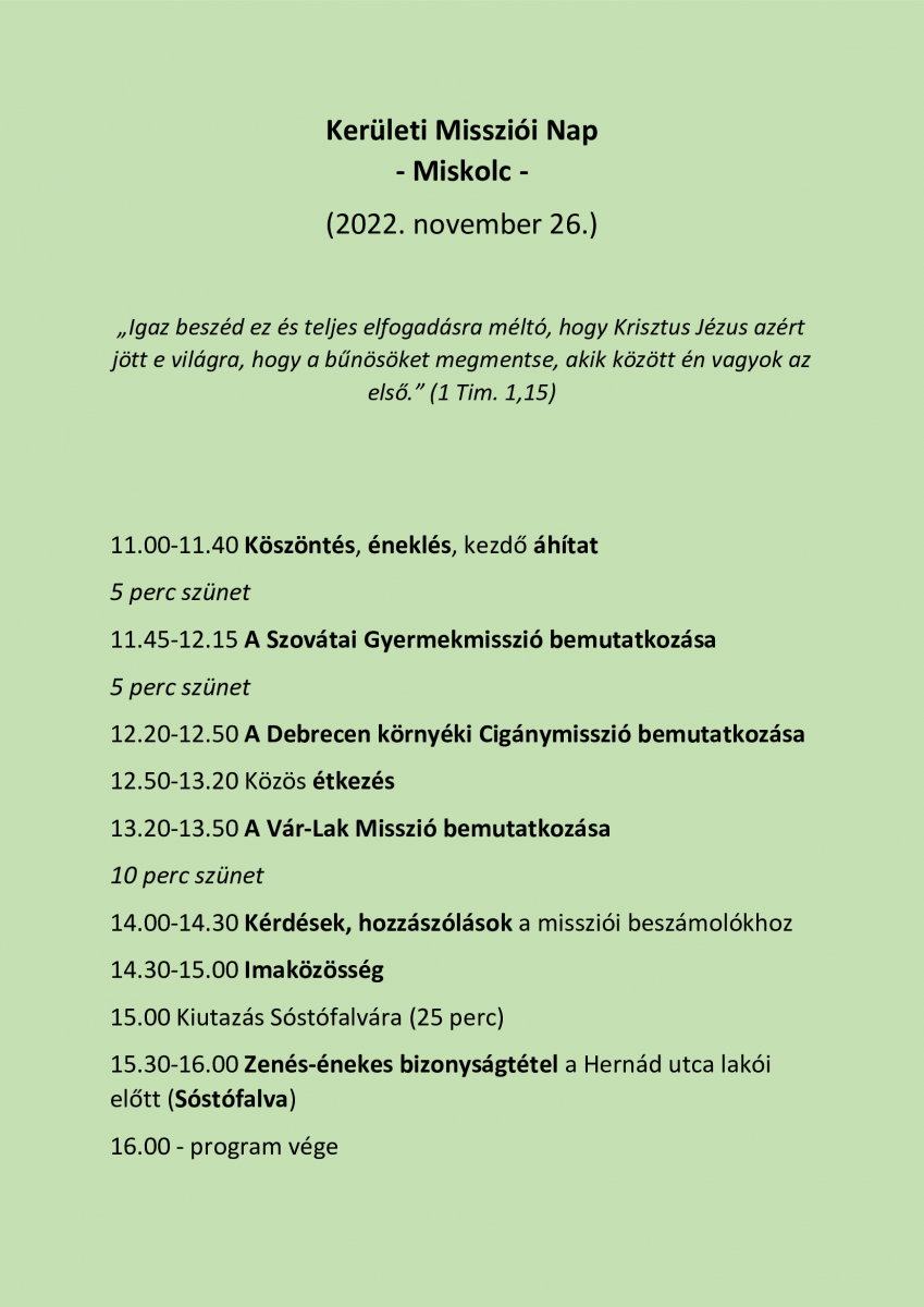 Missziói nap Miskolcon (2022.11.26.)november 24, 2022március 31, 2026 A Missziói Napon az előadásokról (szolgálatokról) felvételt készítünk.
